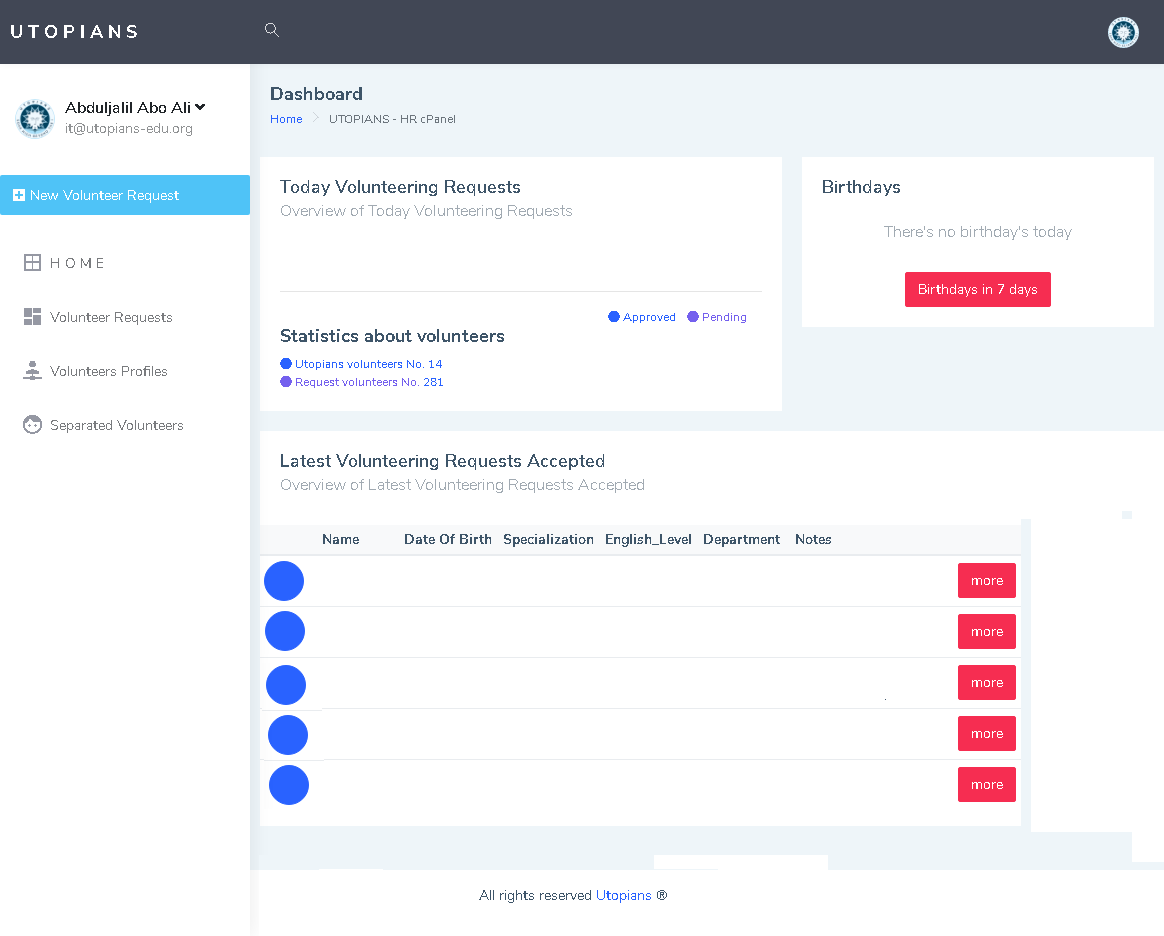 The website coded to organize management information special volunteer logs, volunteer documents, volunteer birthdays, volunteer notes, and any work that improve the organization performance.